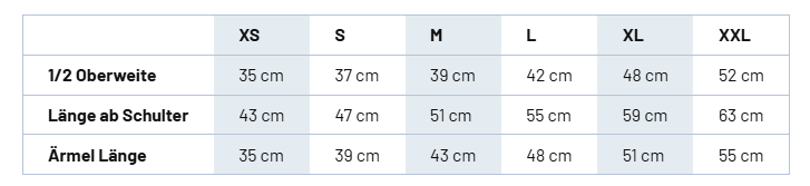 Grössenvergleich mit Körpergrößen in cm: XS=98/104, S=110/116, M=122/128, L=134/140, XL=146/152, XXL=158/164