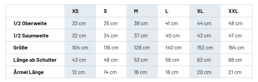 Größenvergleich mit Körpergrößen in cm: XS=98/104, S=110/116, M=122/128, L=134/140, XL=146/152, XXL=158/164